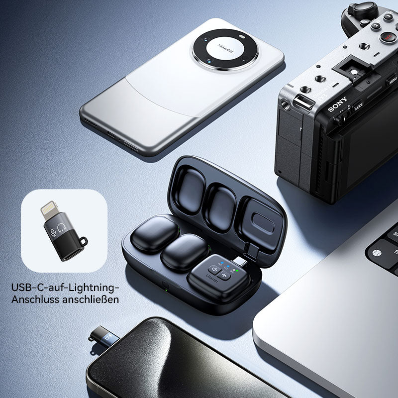Überträgt Audioqualität nahtlos an den Empfänger, indem Sie Ihr Telefon (funktioniert gut mit IOS- und Android-Systemen), Ihre Kamera oder Ihren PC mit dem USB-C-Anschluss, dem USB-C-auf-3,5-mm-Klinke-Adapter oder dem USB-C-auf-Lightning-Anschluss