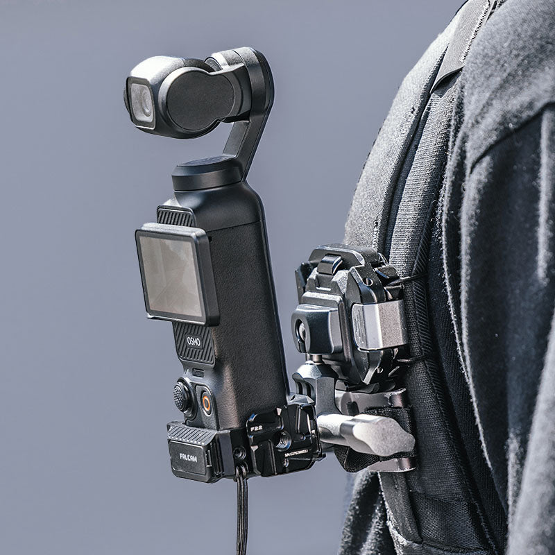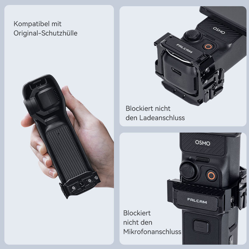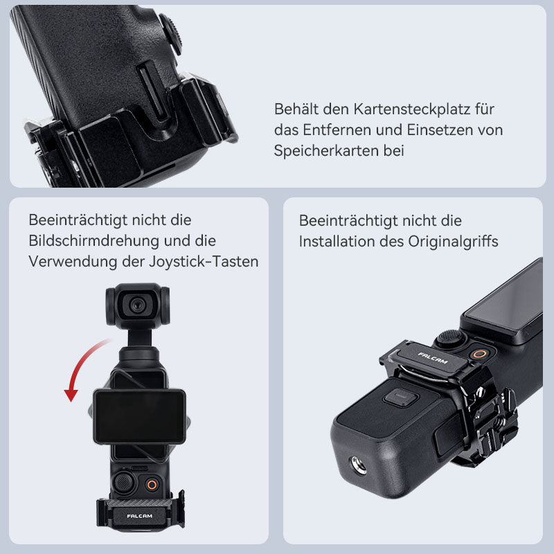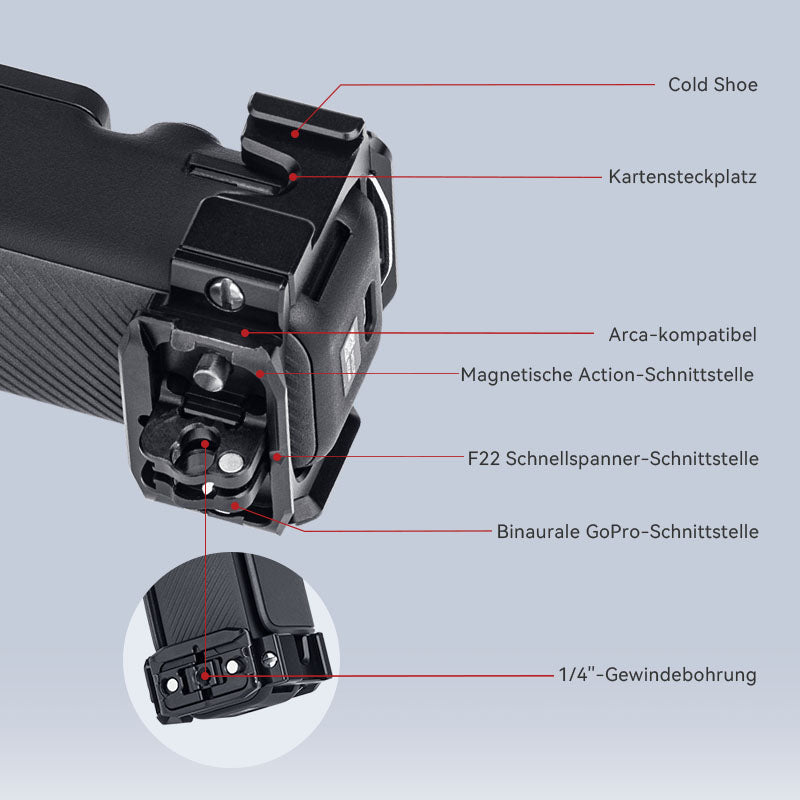 einschließlich F22-Schnellverschluss, Action Magenetic Interface, GoPro Interface, Cold Shoe, 1/4''-Gewindebohrung und Lanyard-Bohrung.