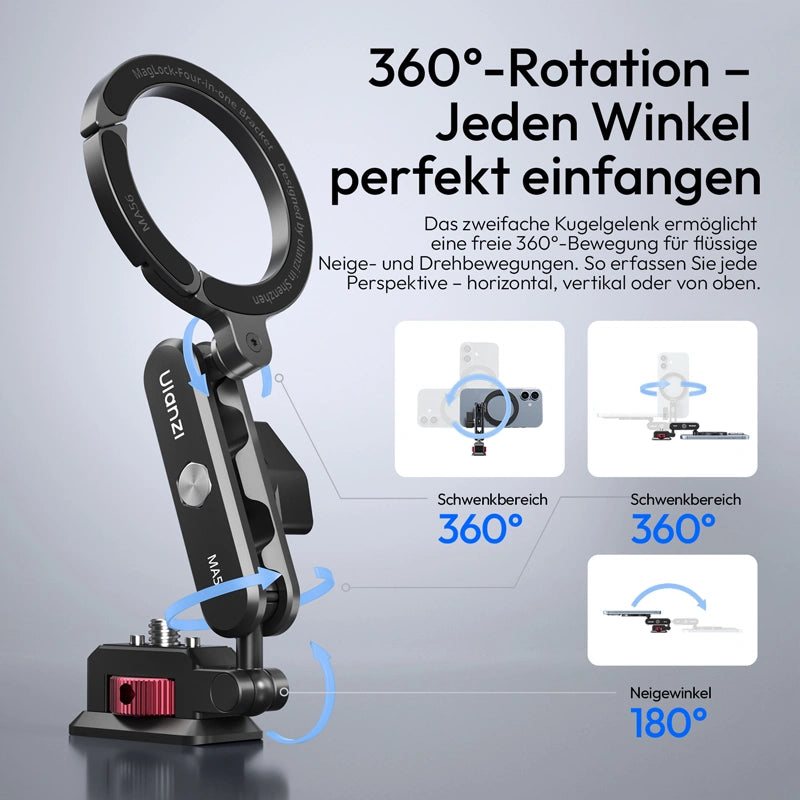 Das zweifache Kugelgelenk ermöglicht eine freie 360°-Bewegung für flüssige Neige- und Drehbewegungen. So erfassen Sie jede Perspektive – horizontal, vertikal oder von oben.