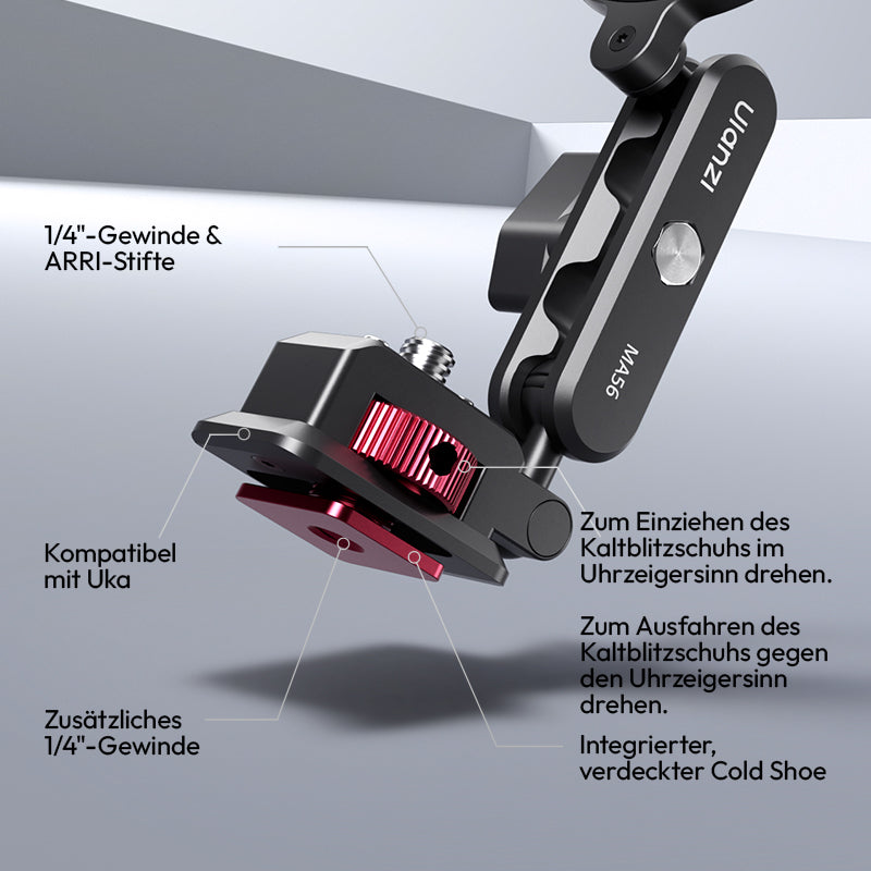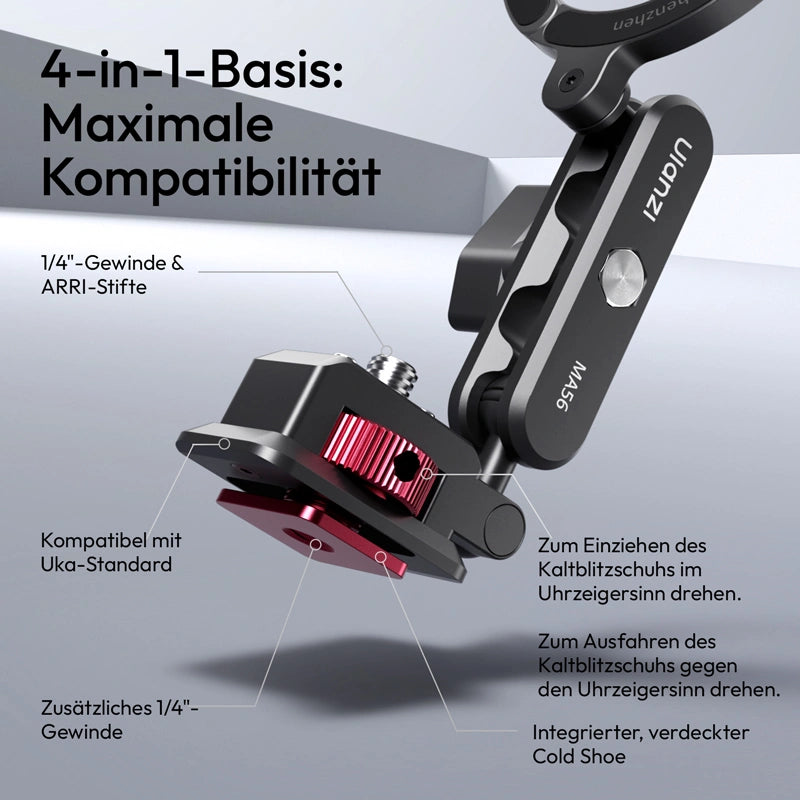 1/4"-Gewinde & ARRI-Stifte, Kompatibel mit Uka, Arca-Swiss-Standard, Zusätzliches 1/4"-Gewinde, Integrierter, verdeckter Cold Shoe