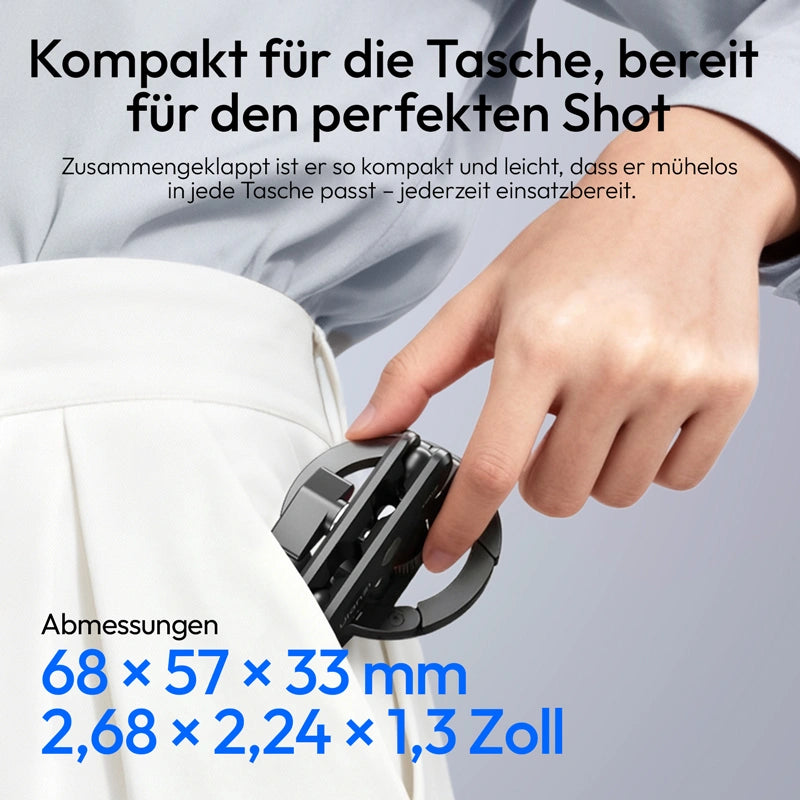 Zusammengeklappt ist er so kompakt und leicht, dass er mühelos in jede Tasche passt – jederzeit einsatzbereit.