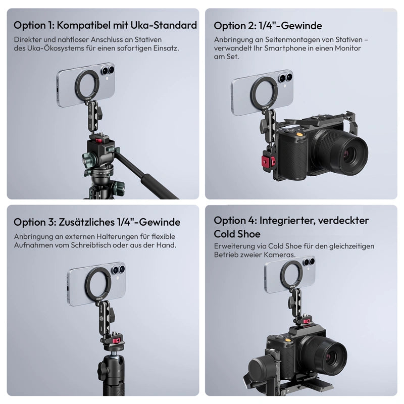 -1/4""-Gewinde: Anbringung an Seitenmontagen von Stativen – verwandelt Ihr Smartphone in einen Monitor am Set.