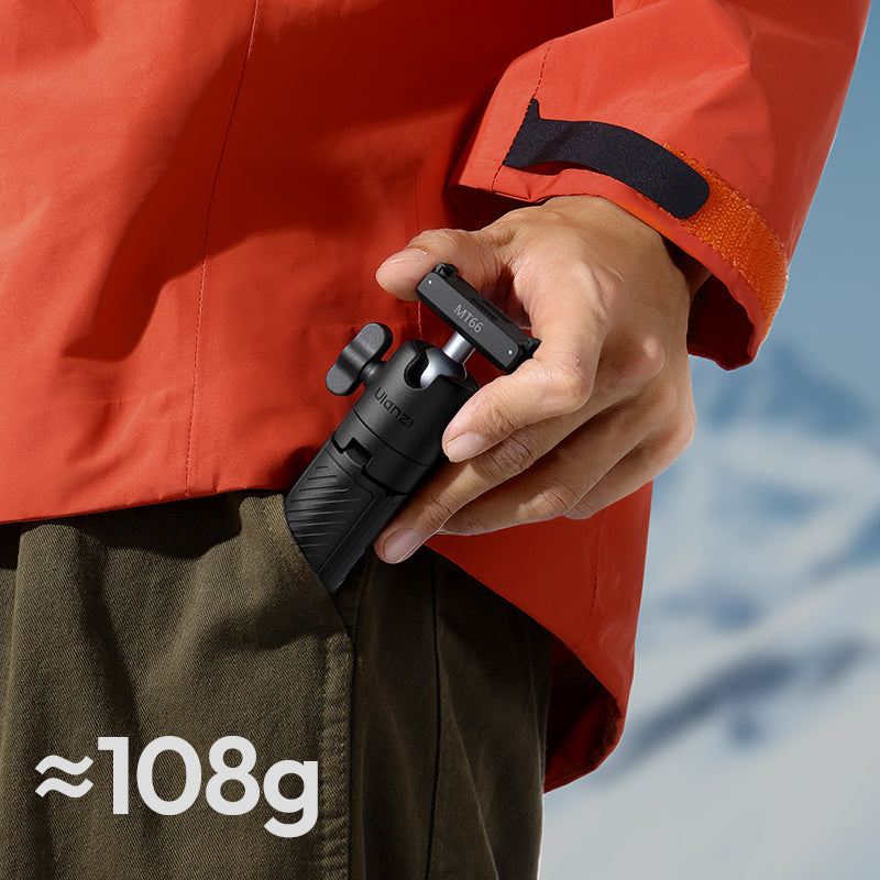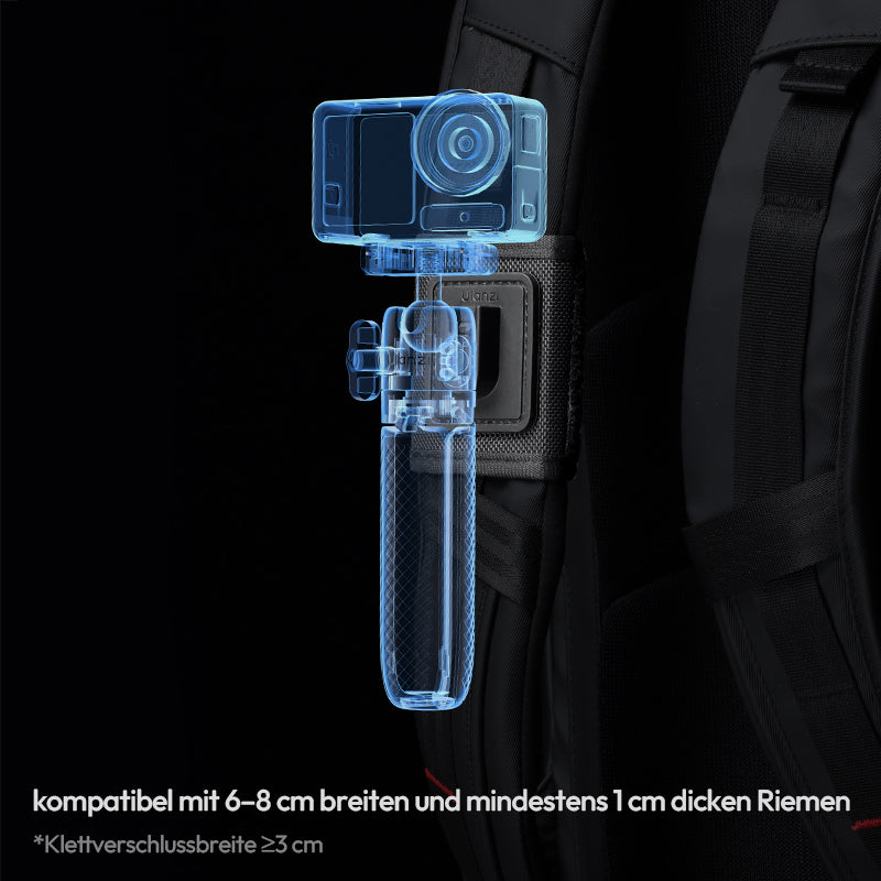 Befestigen Sie das Stativ im Schlitz des Klettbands – einfach nach unten ziehen zum Verriegeln, anheben zum Lösen. Kein Knopfdruck nötig!