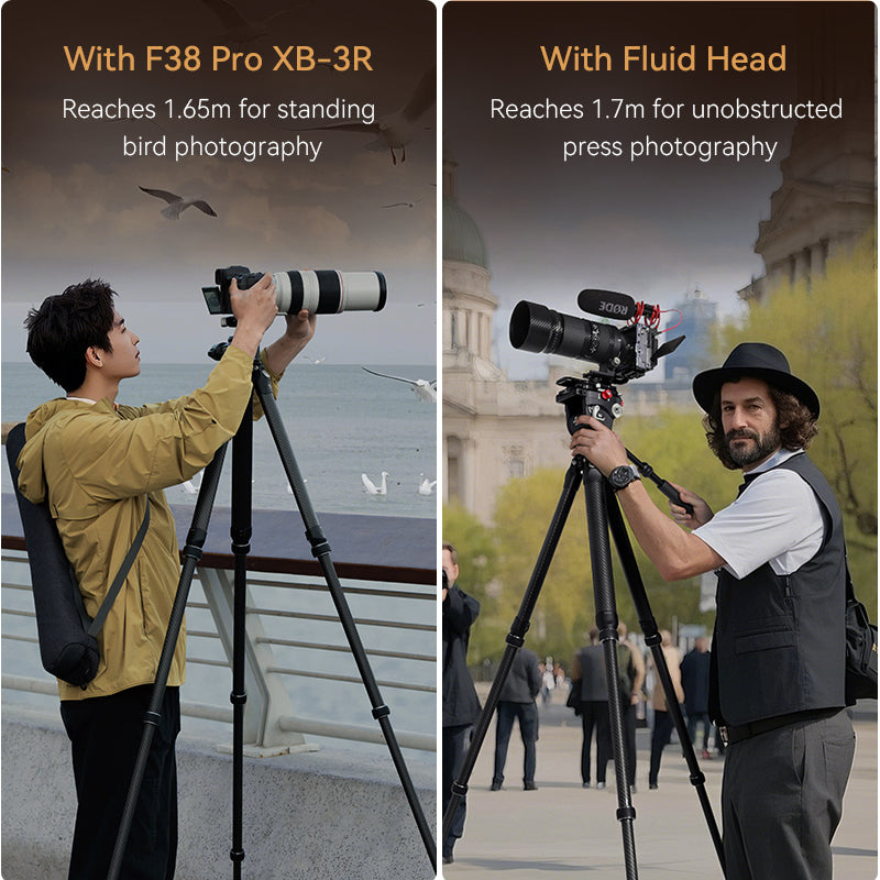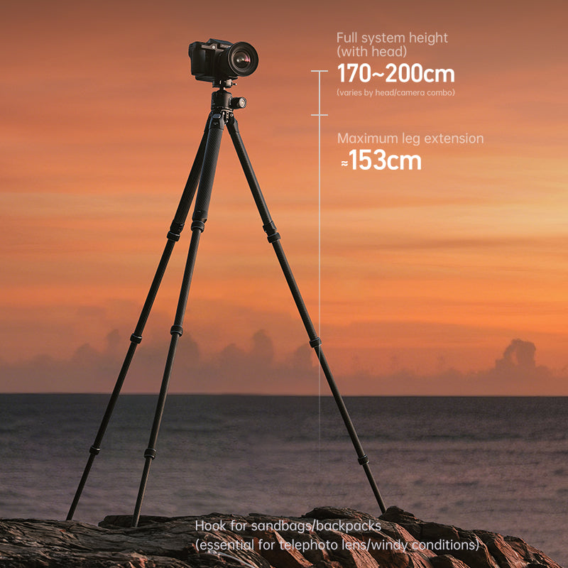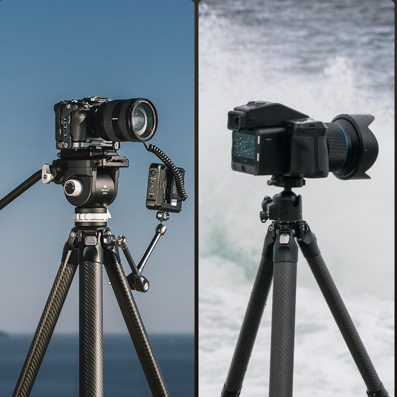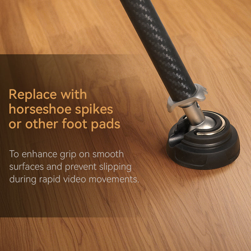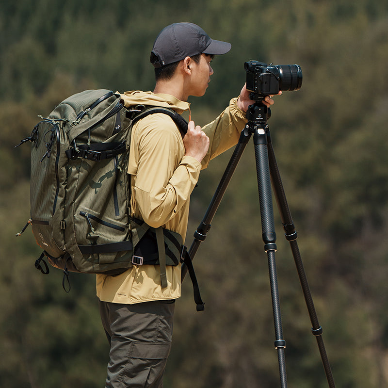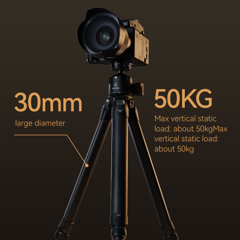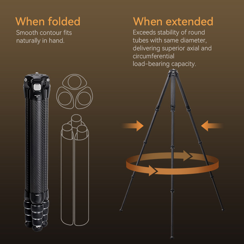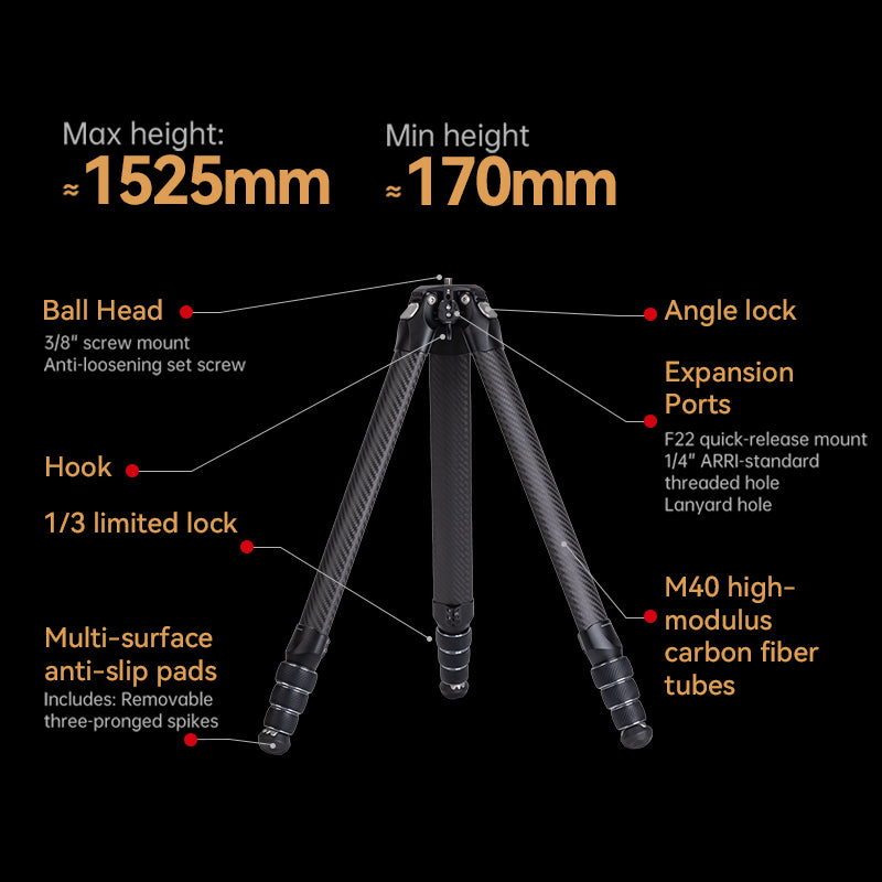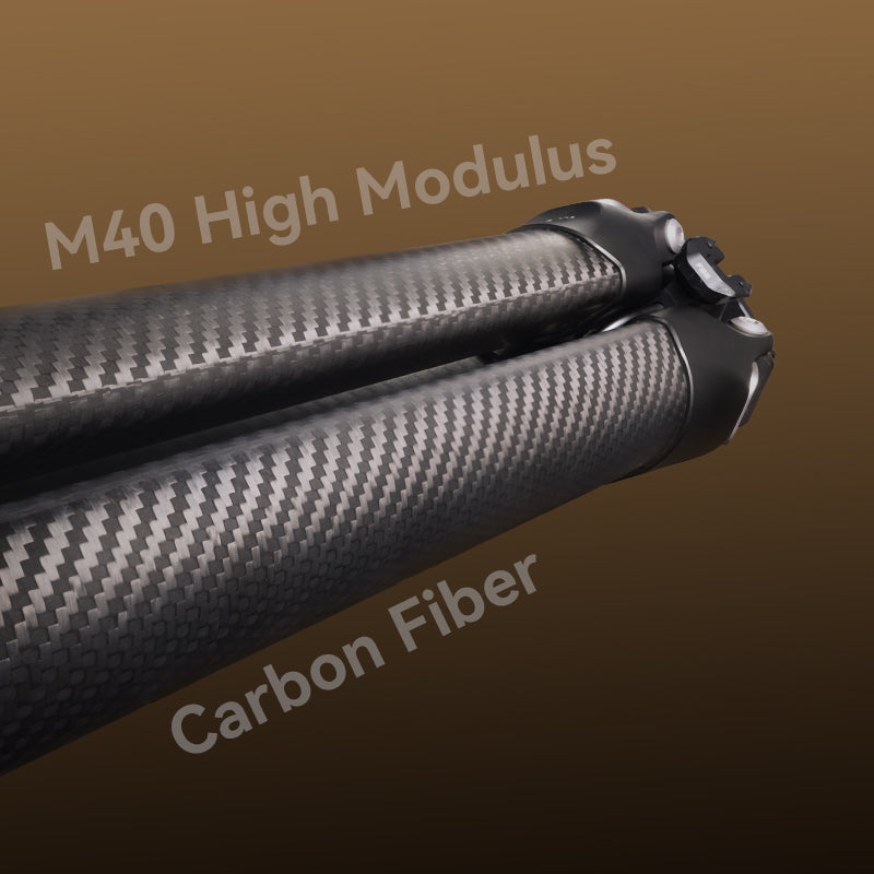 The tripod uses M40 high-modulus carbon fiber. With a 60% higher Young's modulus than T300 at the same monofilament fiber density, it offers improved tensile and flexural strength while maintaining lightweight properties.