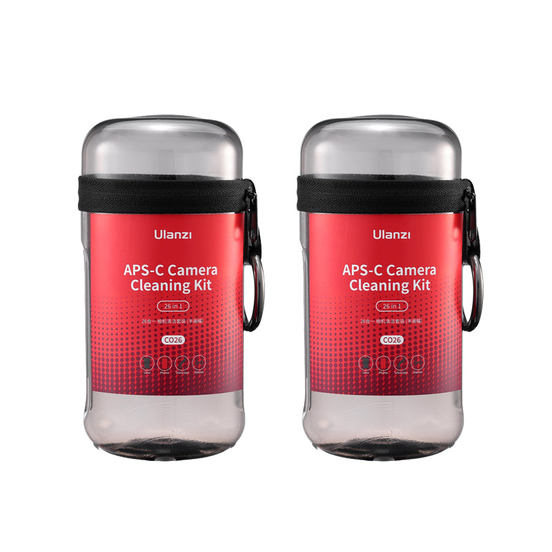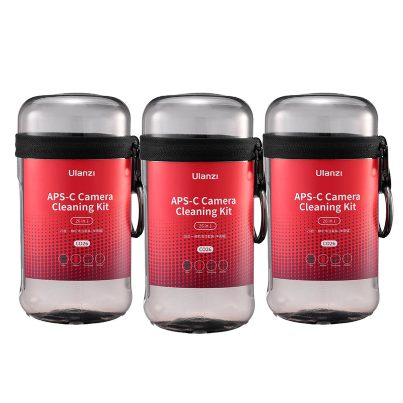 Ulanzi CO26 Camera Cleaning Kit for APS-C Cameras Contains 26 essential camera cleaning items: APS-C sensor cleaning swabs, wet cleaning cloth, cleaning solution, air blower, lens cleaning pen pro, lens cleaning solution, cotton swabs, optical cleaning cloth, and a storage case. All neatly packaged in a box, it's convenient for use on the go and ensures your camera stays clean and free from dust, fingerprints, smudges, water spots, and more.