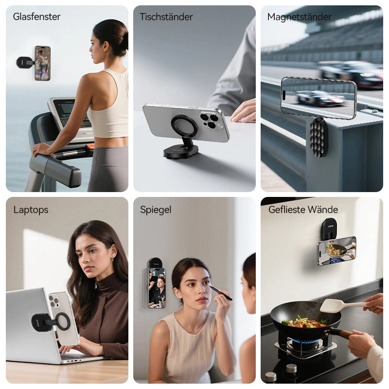 Die flexible Halterung kann als Saugnapfhalterung, magnetischer Ständer oder Tischhalterung verwendet werden, um Ihr Telefon überall sicher aufzubewahren.