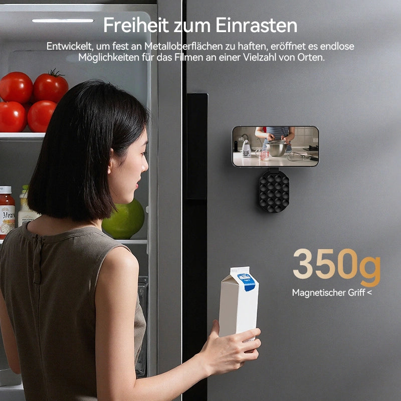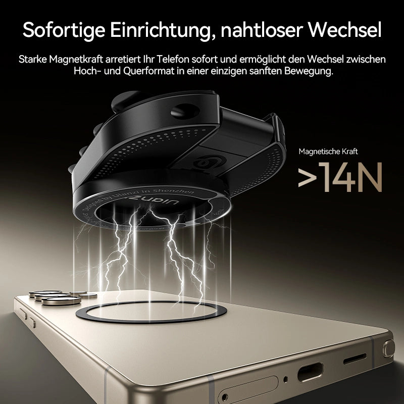 Haftet fest auf Metalloberflächen für vielseitige Filmaufnahmen und verfügt über eine starke Magnetkraft, die Ihr Smartphone sofort fixiert – wechseln Sie mit einer einzigen flüssigen Bewegung nahtlos zwischen Hoch- und Querformat.