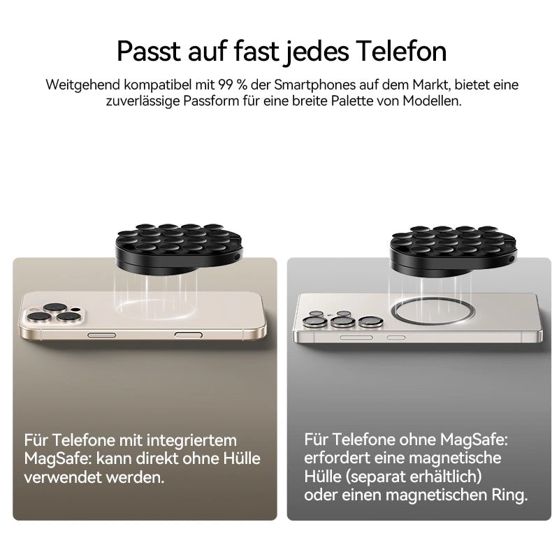 - Für Telefone ohne MagSafe: erfordert eine magnetische Hülle (separat erhältlich) oder einen magnetischen Ring.