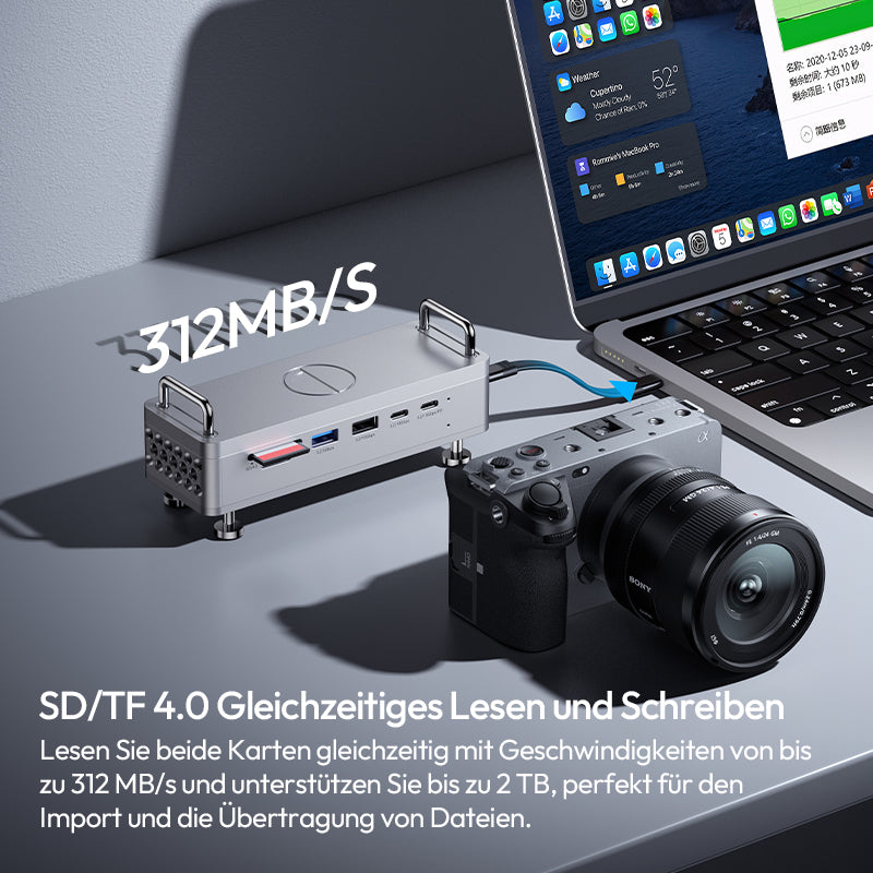 Lesen Sie beide Karten gleichzeitig mit Geschwindigkeiten von bis zu 312 MB/s und unterstützen Sie bis zu 2 TB, perfekt für den Import und die Übertragung von Dateien.