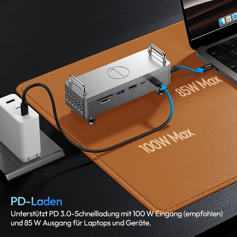 Unterstützt PD 3.0-Schnellladung mit 100 W Eingang (empfohlen) und 85 W Ausgang für Laptops und Geräte.