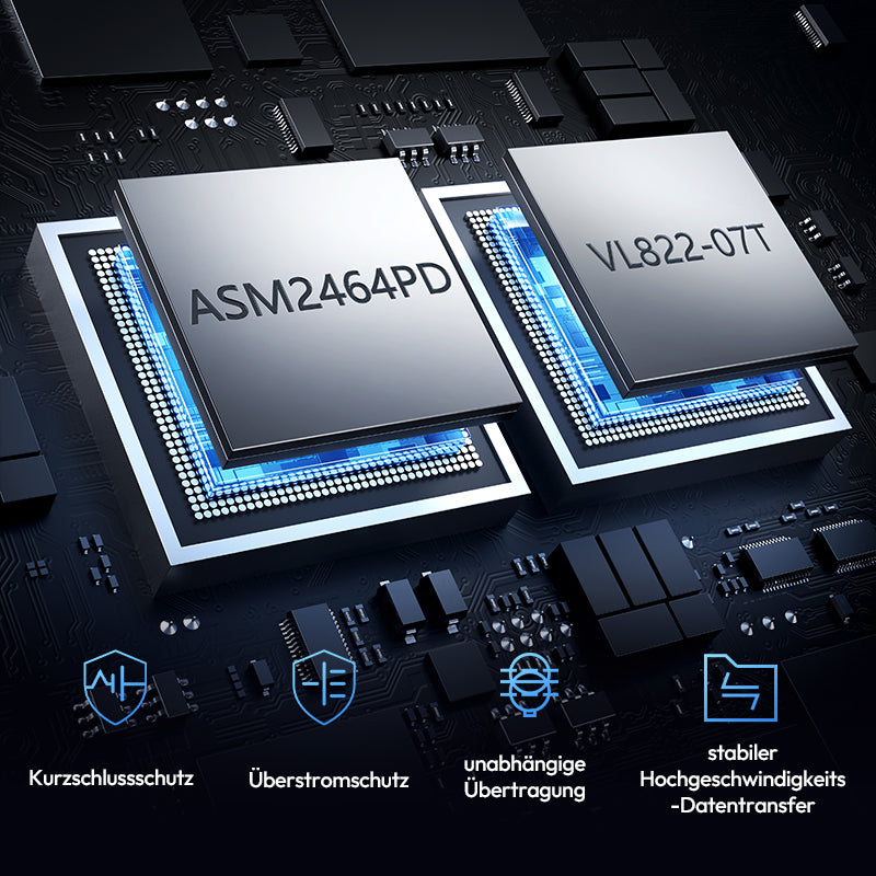 Ausgestattet mit dem ASM2464PD- und VL822-07T-Chip gewährleistet der QT03 eine stabile Hochgeschwindigkeitsleistung mit nahtloser Datenübertragung.