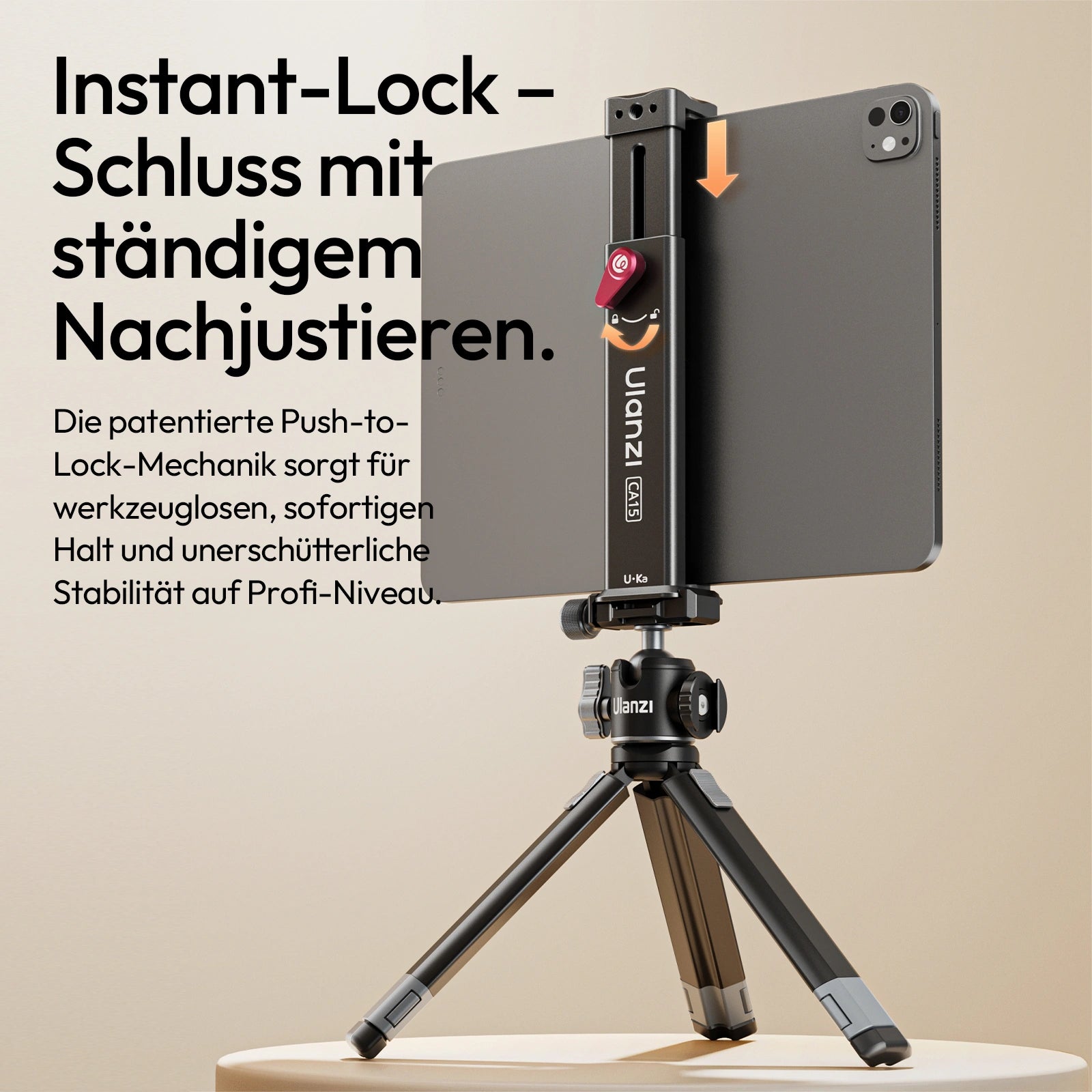 • 1. Instant-Lock: Die patentierte Push-to-Lock-Mechanik sorgt für werkzeuglosen, sofortigen Halt und unerschütterliche Stabilität auf Profi-Niveau.