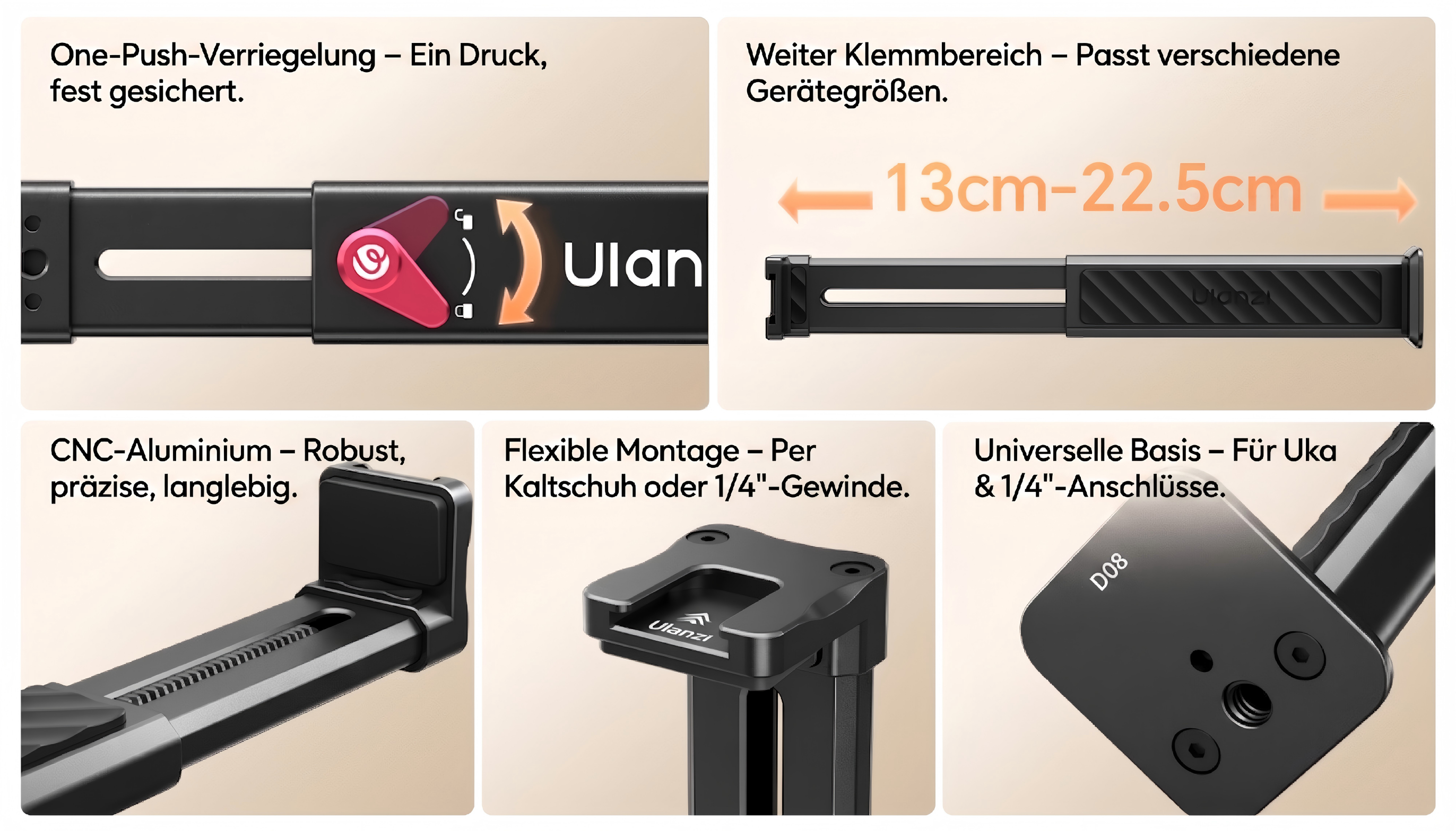 Konzipiert mit universeller Kompatibilität für 1/4", Uka und Arca-Standards. Ermöglicht schnelle und stabile Wechsel zwischen Stativen und anderem Zubehör.