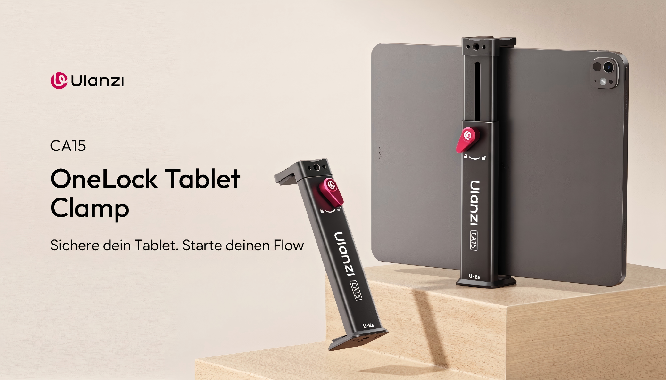 Ulanzi CA15 OneLock Tablet-Halterung in Schwarz mit rotem Verriegelungshebel
