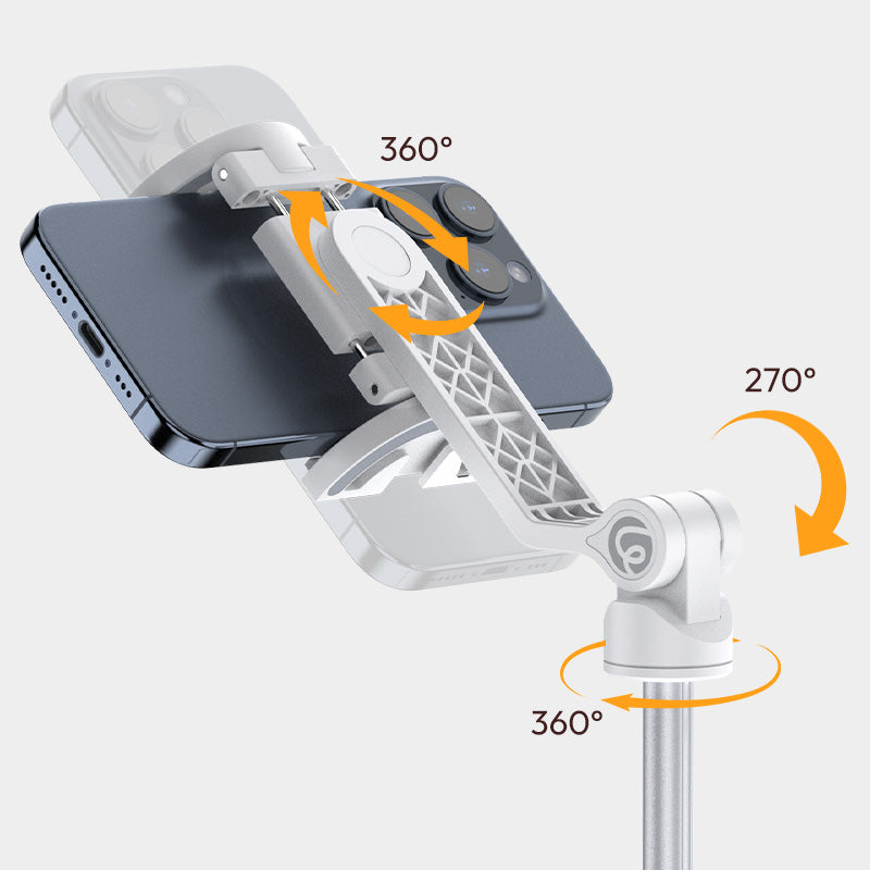 Mit der 360°-Drehung können Sie mühelos zwischen horizontalen und vertikalen Aufnahmen wechseln. Die 270°-Neigung bietet eine breite Palette von Aufnahmewinkeln für jede Situation.