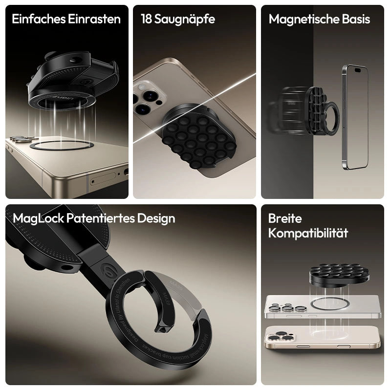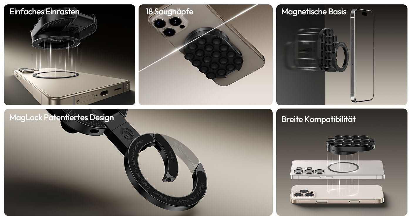 - Für Telefone ohne MagSafe: erfordert eine magnetische Hülle (separat erhältlich) oder einen magnetischen Ring.