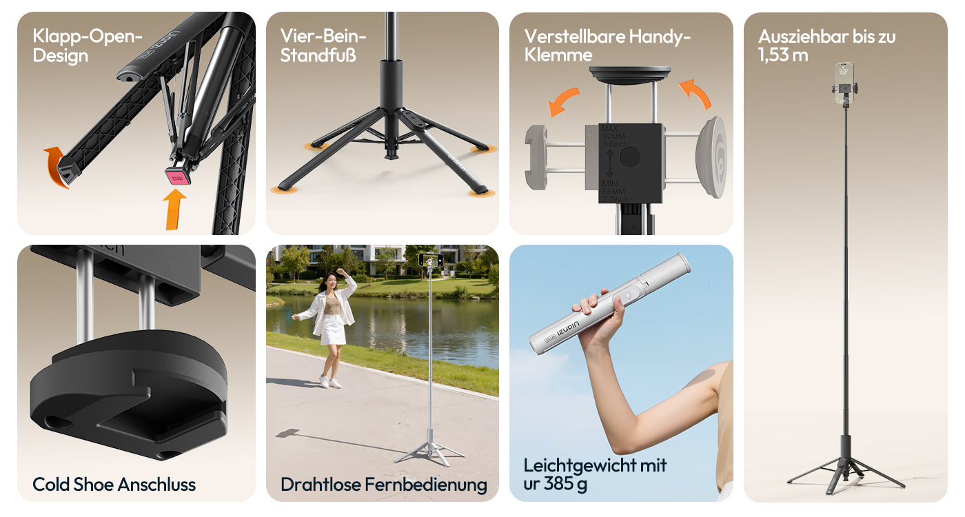 • 1. Klapp-Open-Design: Einfach hinstellen, und die Beine klappen blitzschnell auf – für ein müheloses, freihändiges Setup.