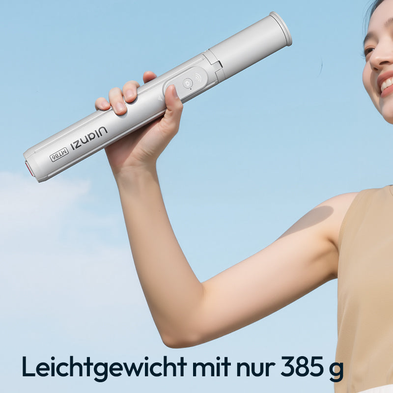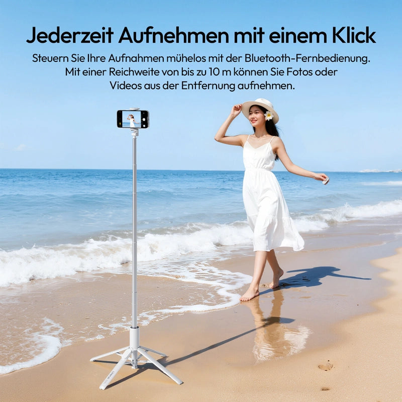 Mit ausziehbarer Länge bis 1,46 m für Weitwinkel- und Gruppen-Selfies sowie Bluetooth-Fernbedienung bis 10 m Reichweite – volle kreative Kontrolle über Ihre Aufnahmen aus jeder Position.
