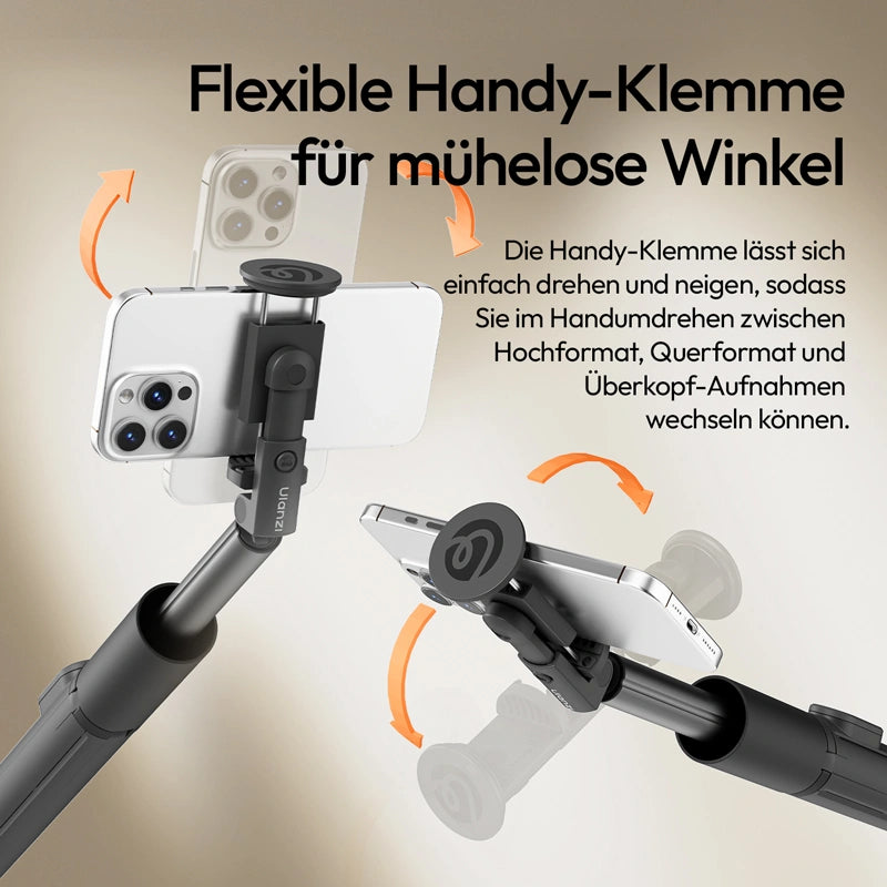 Die Handy-Klemme lässt sich einfach drehen und neigen, sodass Sie im Handumdrehen zwischen Hochformat, Querformat und Überkopf-Aufnahmen wechseln können.