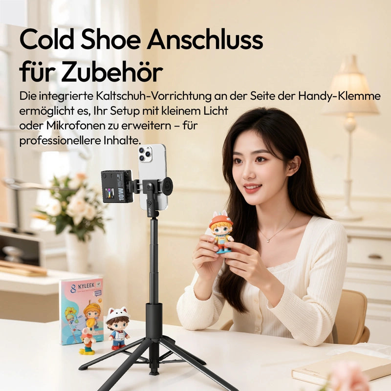 Die integrierte Kaltschuh-Vorrichtung an der Seite der Handy-Klemme ermöglicht es, Ihr Setup mit kleinem Licht oder Mikrofonen zu erweitern – für professionellere Inhalte.