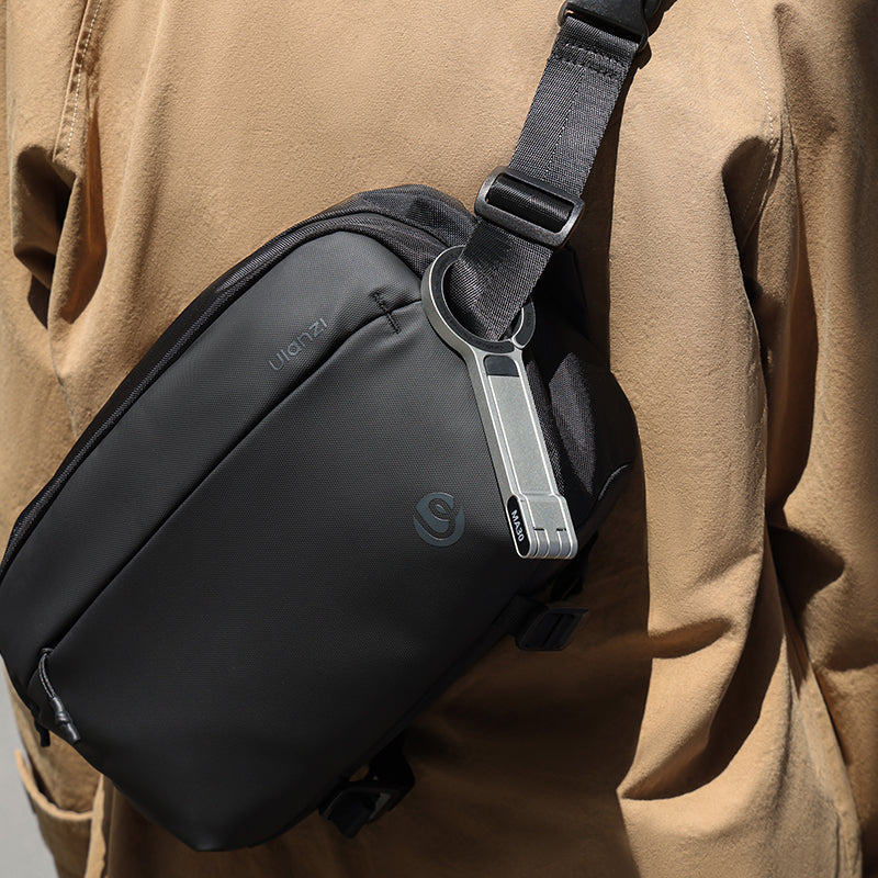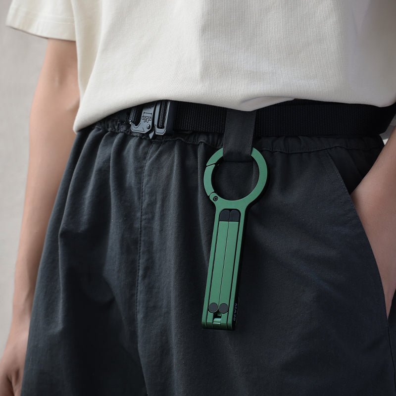 Das Design in Form eines Karabiners erleichtert das Einhaken und macht Ihre Hände frei für problemloses Reisen. Jederzeit und überall aufnahmebereit.