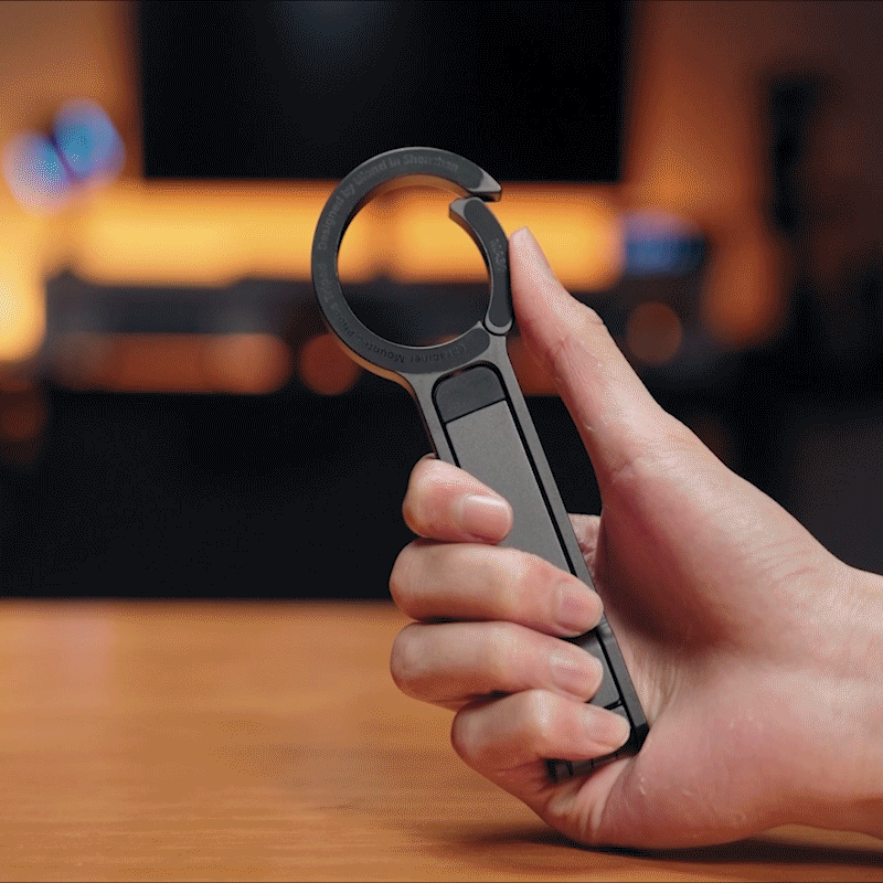 Das Design in Form eines Karabiners erleichtert das Einhaken und macht Ihre Hände frei für müheloses Reisen. Jederzeit und überall aufnahmebereit.