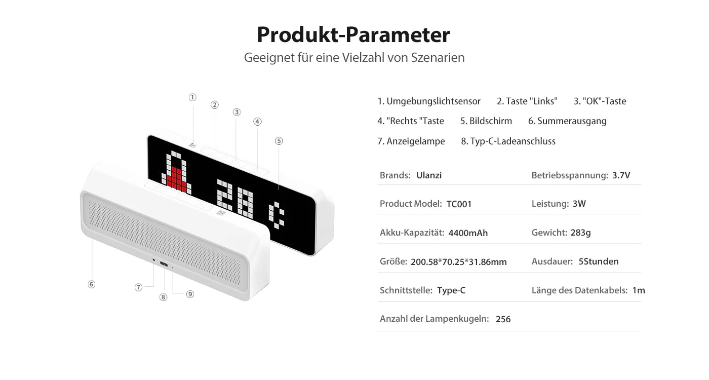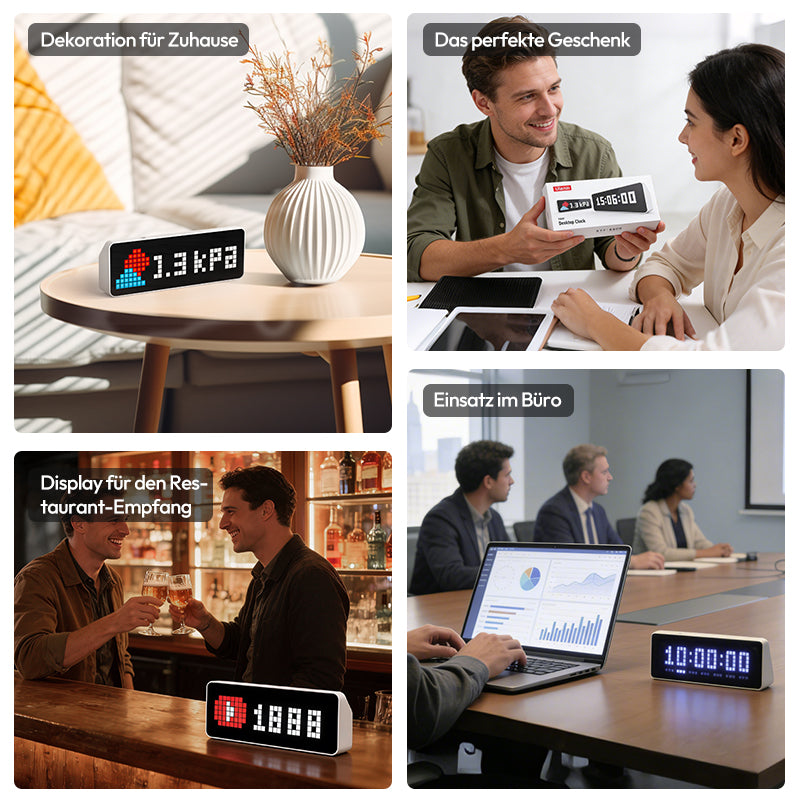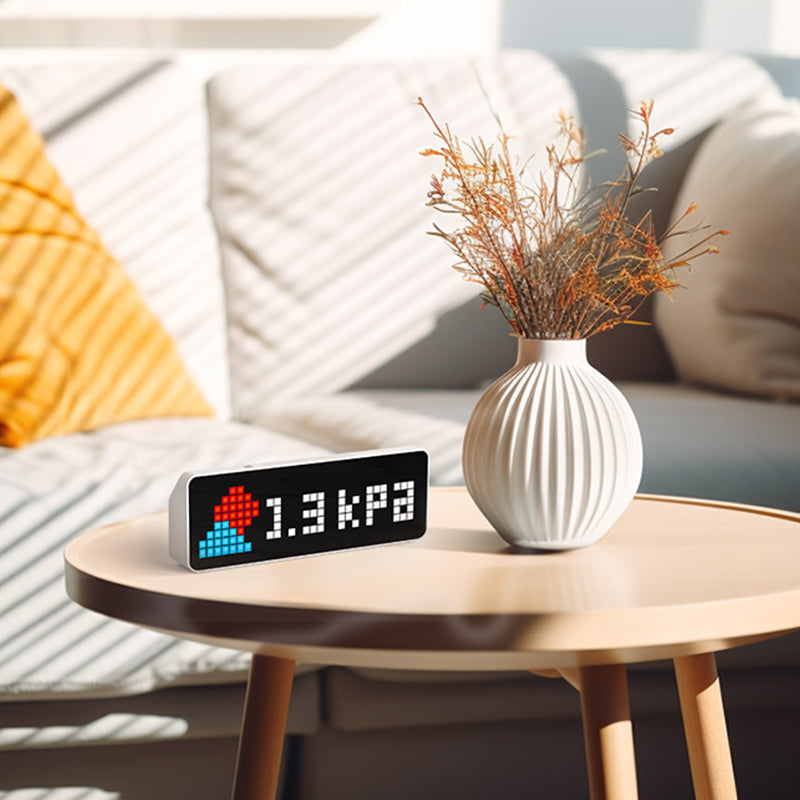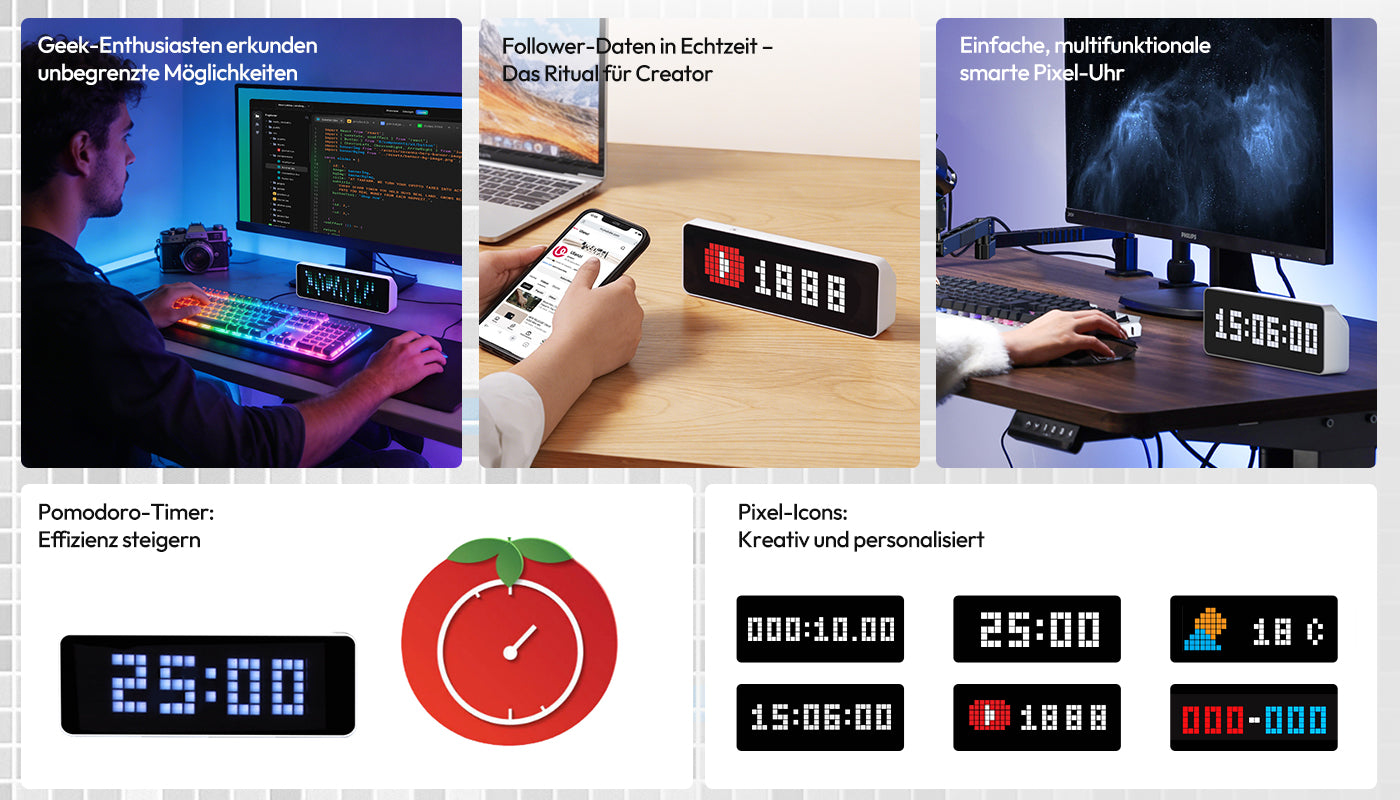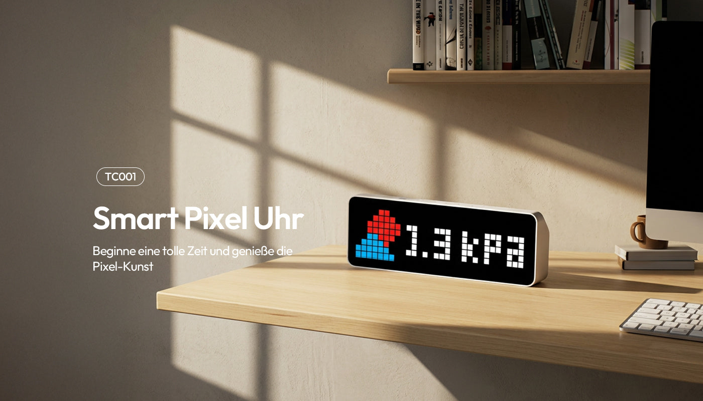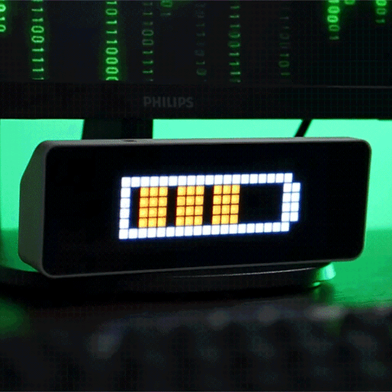 Vergessen Sie kühle Digitalanzeigen. Lassen Sie 8-Bit-Pixelkunst Ihren Raum sanft beleuchten. Das Vollfarb-LED-Display unterstützt eigene Icons und kombiniert Retro-Charme mit moderner Optik – ein einzigartiges Highlight für jeden Schreibtisch.