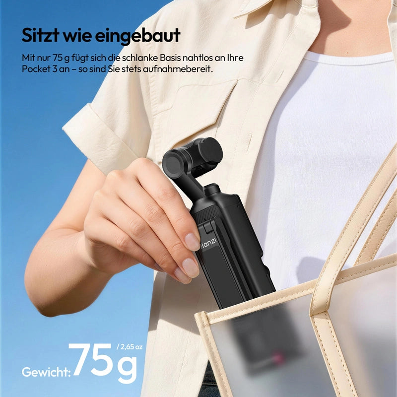 Mit nur 75 g fügt sich die schlanke Basis nahtlos an Ihre Pocket 3 an – so sind Sie stets aufnahmebereit.