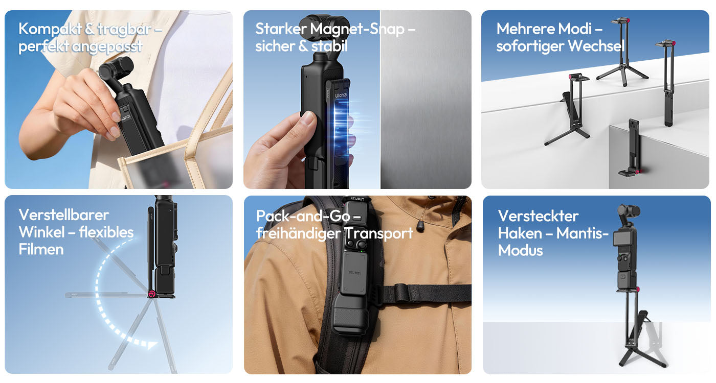 • 3. Mehrere Modi, sofortiger Wechsel: Wechseln Sie mühelos zwischen Handheld- und Stativ-Setups, um jede Aufnahmesituation zu meistern.
