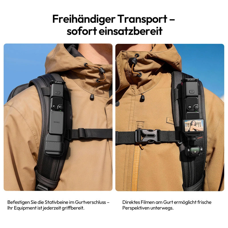 Befestigen Sie die Stativbeine im Gurtverschluss – Ihr Equipment ist jederzeit griffbereit. Direktes Filmen am Gurt ermöglicht frische Perspektiven unterwegs.