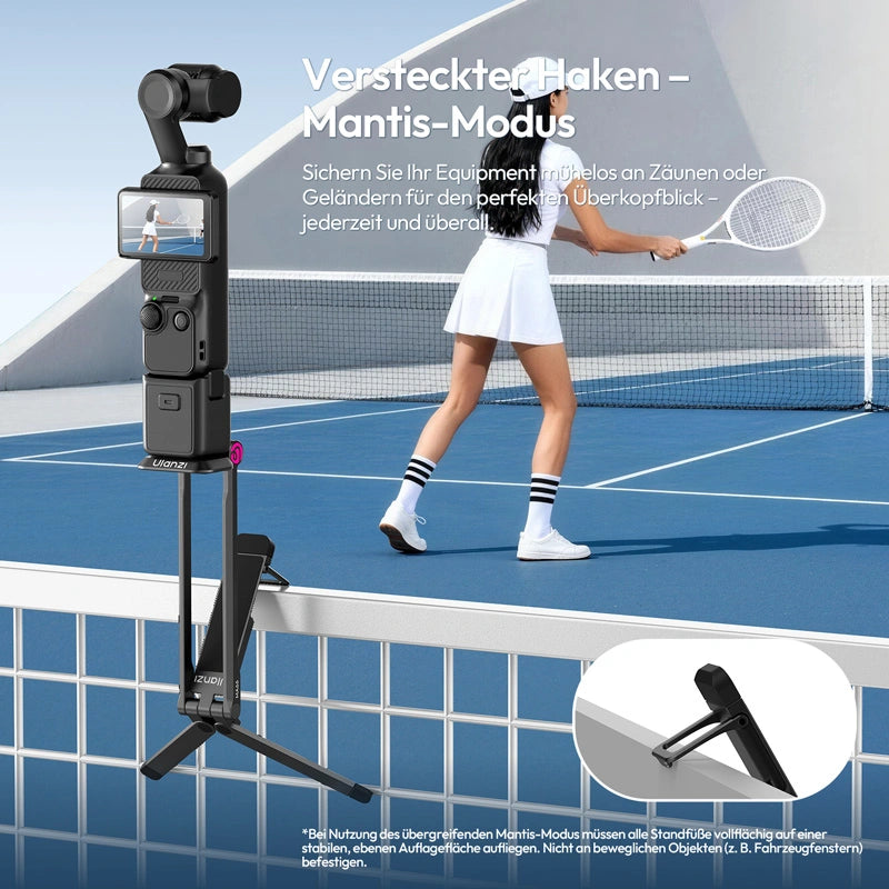 • 5. Versteckter Haken, Mantis-Modus: Befestigen Sie Ihre Ausrüstung sicher an Zäunen oder Geländern – ideal für die perfekte Vogelperspektive.