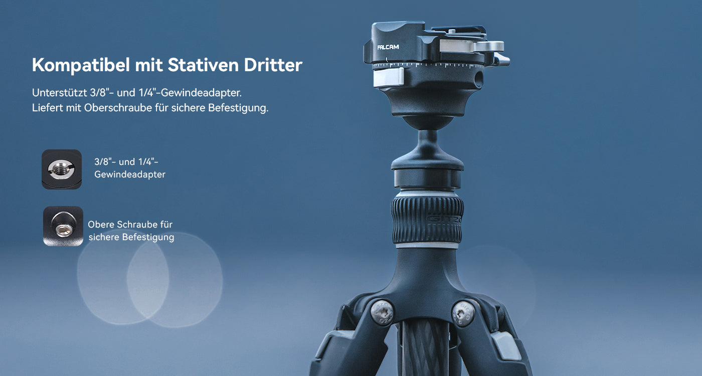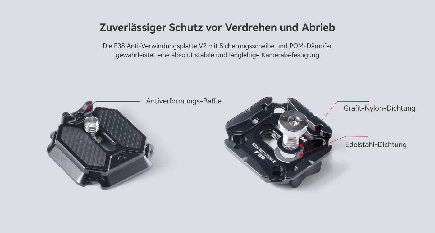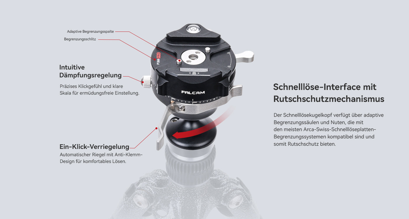 Der F38 Pro ist mit 90 % der Arca-Swiss-Standardplatten kompatibel. Durch Druck auf die Platte wird diese automatisch verriegelt – auch ohne Stativaufbau.