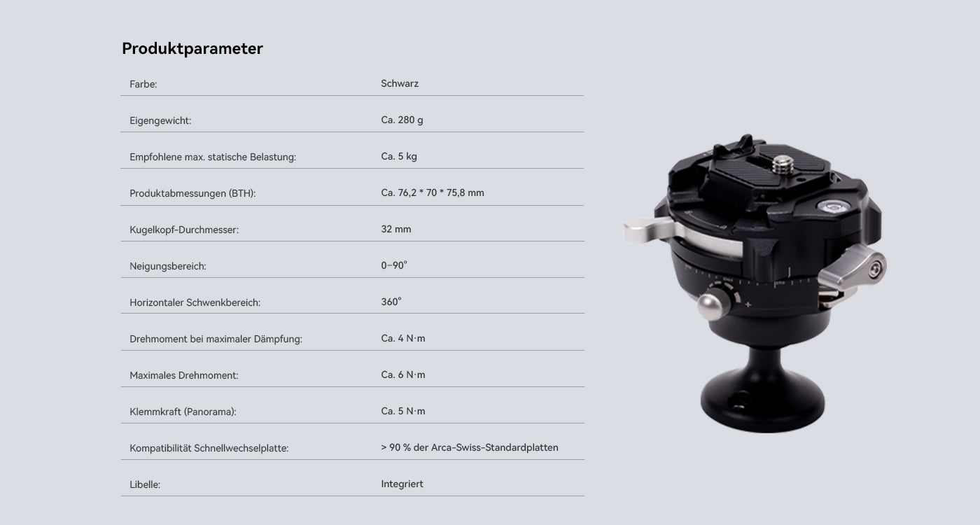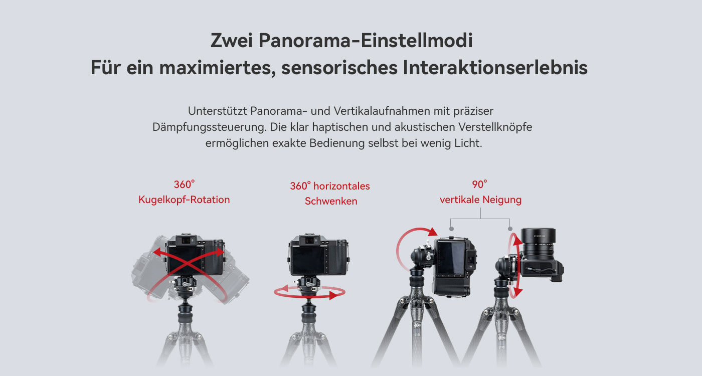 Die präzise Dämpfungs-Feinabstimmung ermöglicht ein äußerst exakt und flüssiges Bewegen des Kugelkopfs. Dies führt zu einer direkteren und präziseren Kontrolle bei der Bildgestaltung.