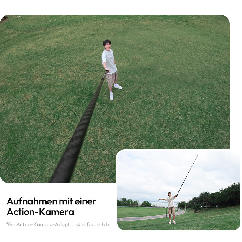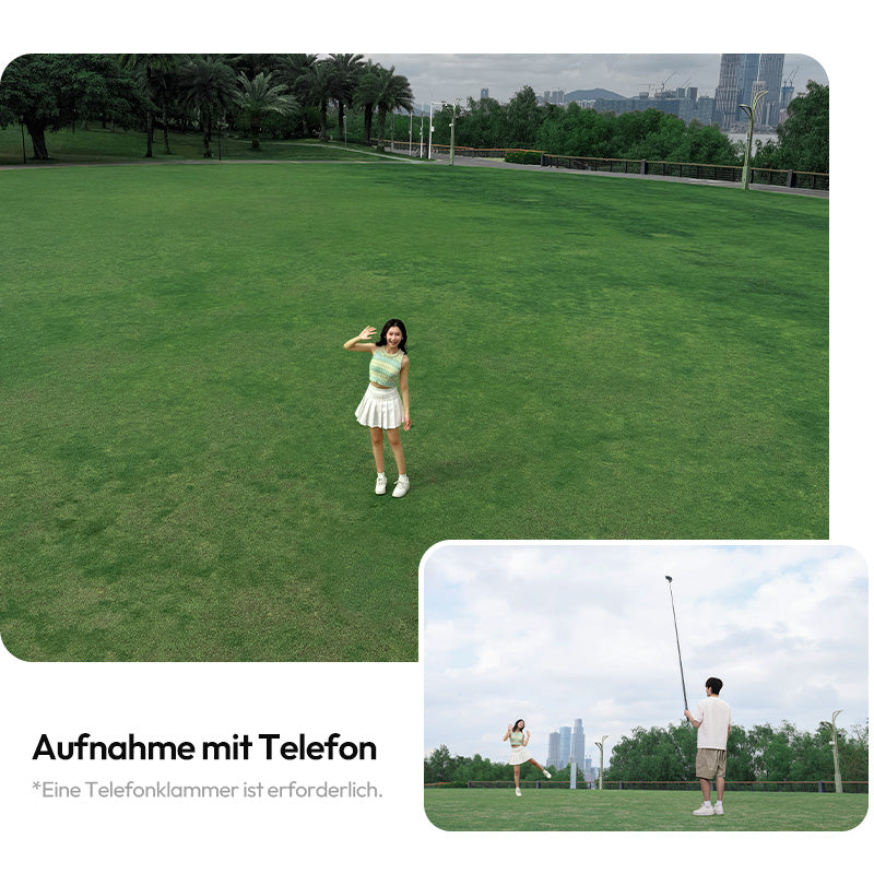 325g überall hin mitnehmen, überall erstellen! Kombinieren Sie die Kamera mit einer Panorama-Sportkamera, um Drohnenaufnahmen zu machen, ohne eine Drohne zu benötigen! Machen Sie mühelos atemberaubende Überkopf-, Verfolgungs- und Schwenkaufnahmen.