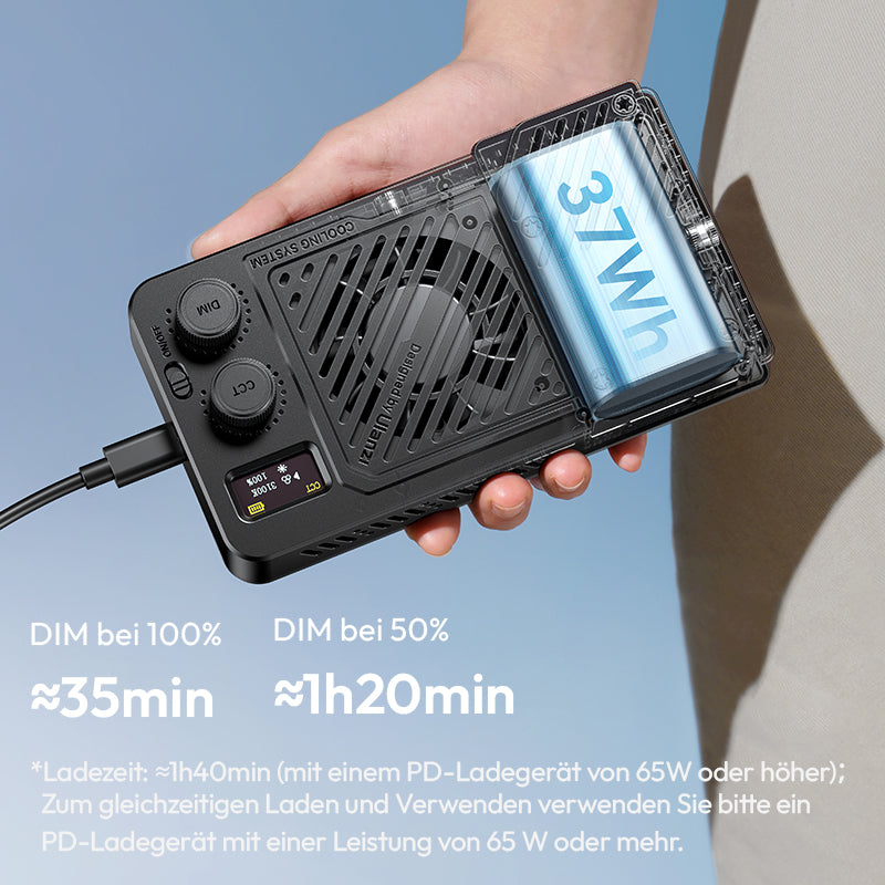 Das ausgehöhlte Design und der eingebaute Lüfter sorgen dafür, dass Ihre Lampe kühl bleibt und auch bei langen Shootings zuverlässig funktioniert.