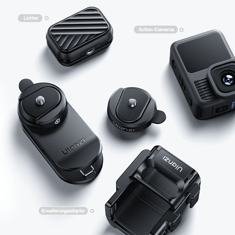 Dank des 1/4"-Standardgewindes lässt er sich nahtlos in eine Vielzahl von Geräten integrieren, von Action-Kameras über Leuchten bis hin zu Erweiterungsadaptern.