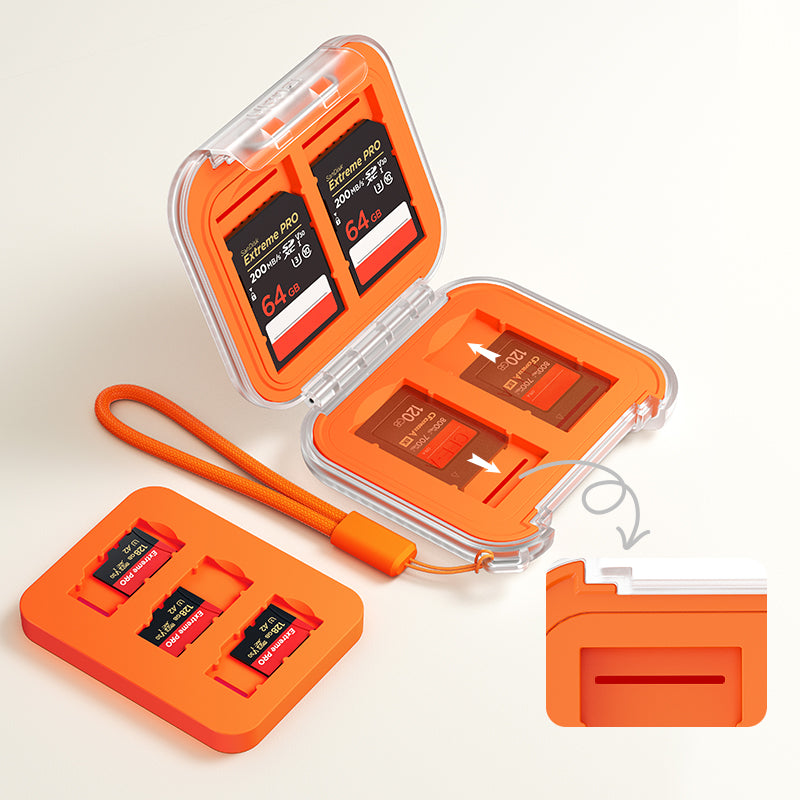 Passen Sie Ihre Kartenfächer an - tauschen Sie den Silikoneinsatz aus, um SD-, TF- oder CFA-Karten einzusetzen. Wählen Sie 2 von 3 Kartenfächern für eine organisierte Aufbewahrung.