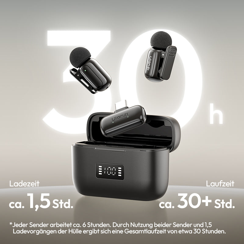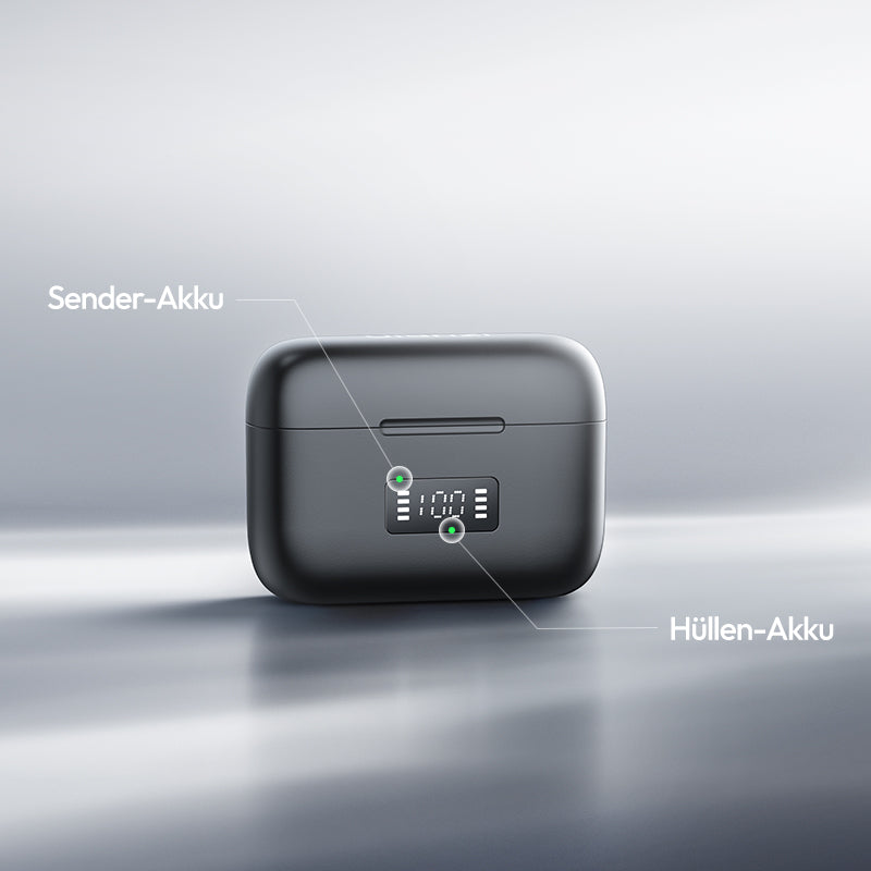 * Jeder Sender arbeitet ca. 6 Stunden. Durch Nutzung beider Sender und 1,5 Ladevorgängen der Hülle ergibt sich eine Gesamtlaufzeit von etwa 30 Stunden.