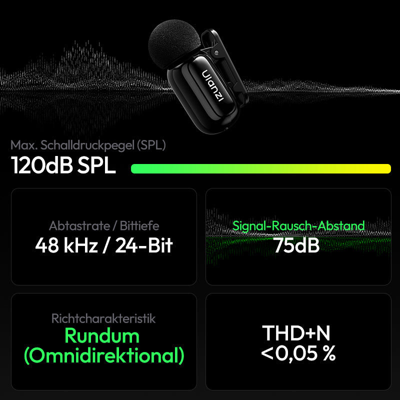 • 1. Studioqualität: 48 kHz / 24-Bit, Max. Schalldruckpegel (SPL): 120 dB, Signal-Rausch-Abstand: 75 dB, Richtcharakteristik: Rundum (Omnidirektional)