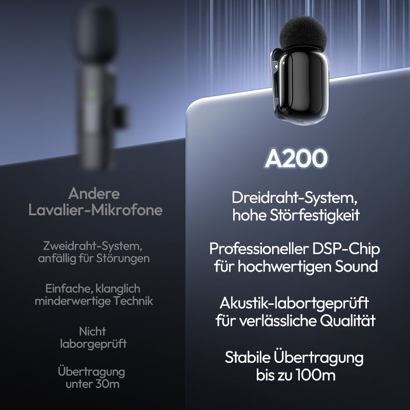 • 2. Plug & Play: Dank knopflosem Design koppelt sich das A200 automatisch und zeichnet mühelos auf – mit intelligenter Geräuschunterdrückung für kristallklaren Profi-Sound.