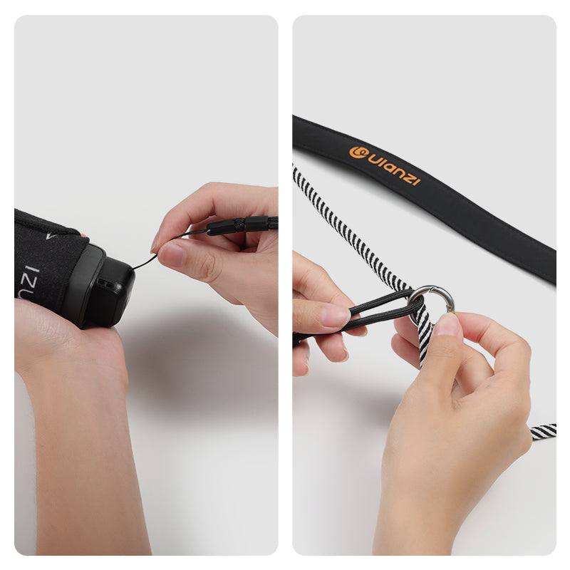 Befestigen Sie beide Enden des Handgelenkriemens am Loch für das Schlüsselband des Pocket 3 und am Ringclip, und haken Sie dann den Ringclip am Schulterriemen ein.